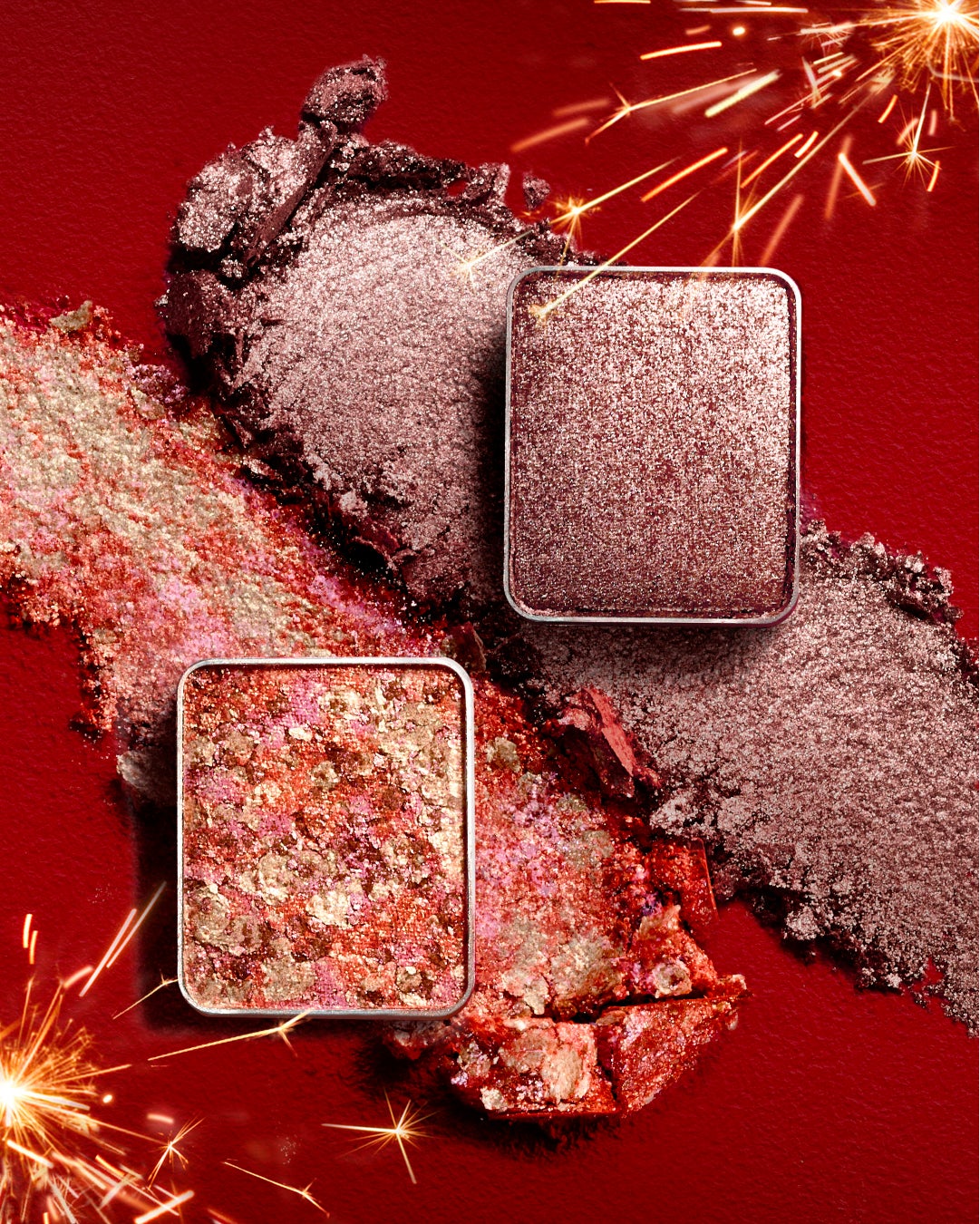 赤いクリアケースに魅惑的なホログラフィックゴールドで花火を描いた、新年の祝福にぴったりな限定デザインです。プレスド アイシャドーなら2色、フェイス カラーなら1色をセットできます。