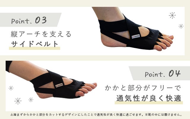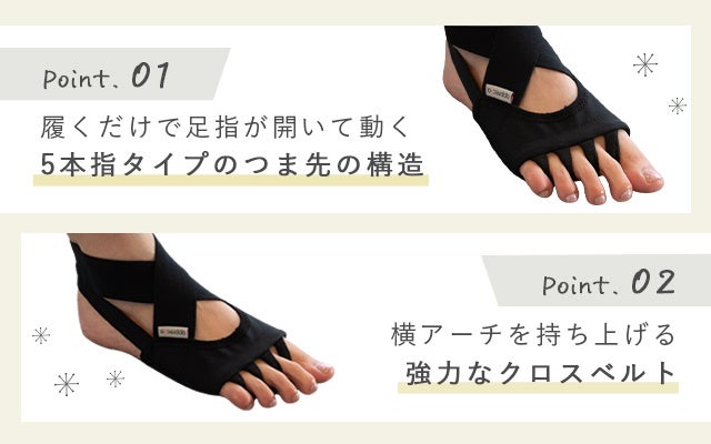 履くだけで自然と足指が開くようになっているのはもちろん、かかとや足指が出ているので、履きながら朝の準備をすることができます。足指を開くことで心身ともに快適であることができ、さらにクロスベルトで足裏アーチをサポートしているので、抜群のフィット感で立ち仕事を頑張った脚をケアして、夕方になっても軽やかに脚をサポートします。