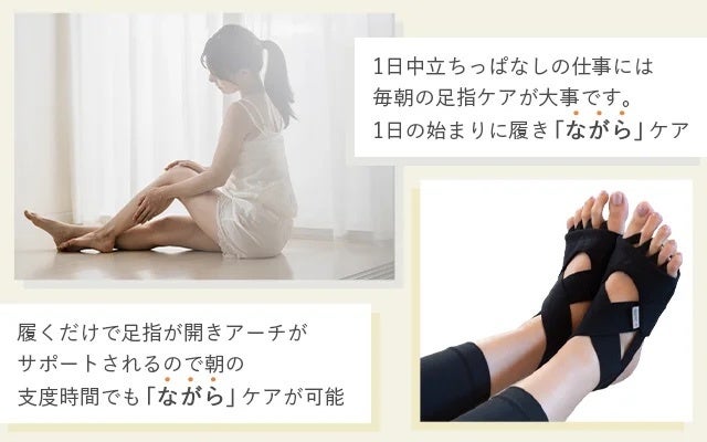 働く女性の新しいモーニングルーティンとして、朝10分履くだけで1日頑張る足をサポートします。