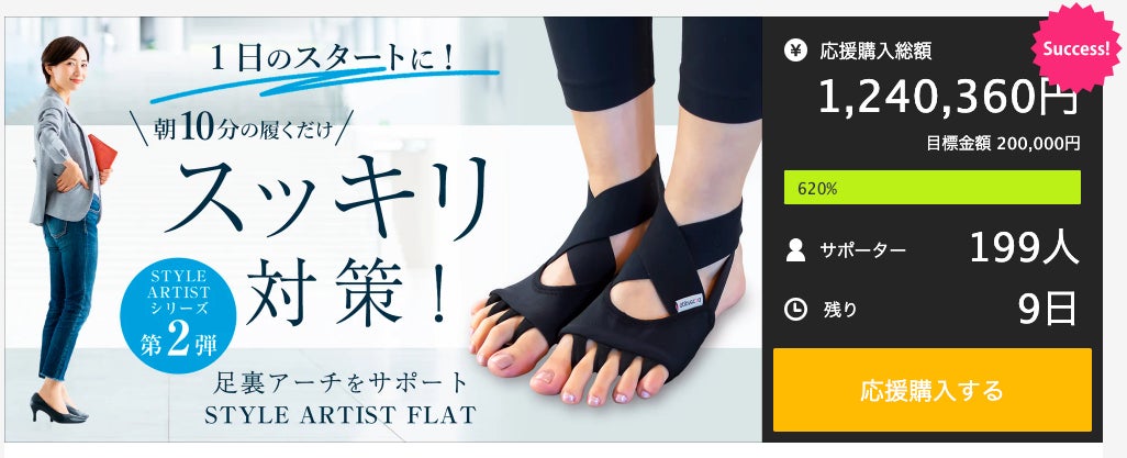 通信販売事業をおこなう株式会社YOUTORIO(本社:東京都渋谷区、代表取締役社長:左子義則)は、1日のスタートに!朝10分の履くだけスッキリ対策!『STYLE ARTIST FLAT(スタイルアーチスト フラット)』を、2022年11月30日(水)よりアタラシイものや体験の応援購入サービス「Makuake」にて先行販売を開始しました。わずか15分で目標金額に到達しました。また、12月15日現在、応援購入金額120万円で目標金額の600%を達成したことをご報告します。12月30日まで特別割引価格にて販売予定です。