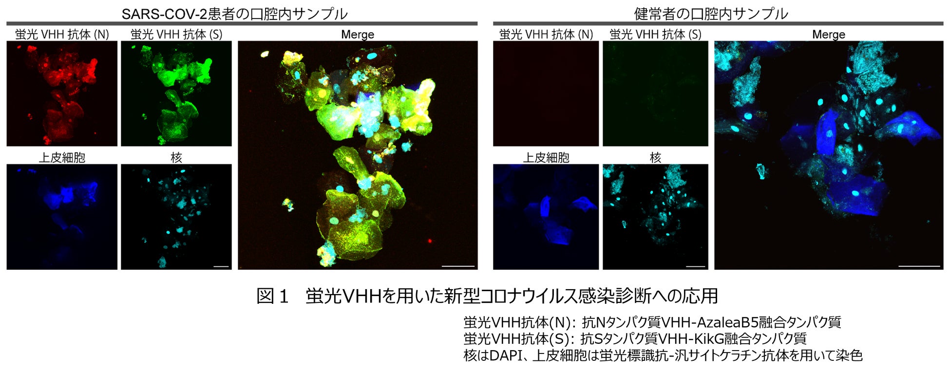 一方で花王は、VHH抗体をウイルス研究のさまざまな用途に応用する検討も進めています。VHH抗体に蛍光を発するタンパク質(蛍光タンパク質)を付けると、光る目印のついたVHH抗体が作製できます。2022年4月には、理研、東北大学の研究グループが創出したタマクラゲ由来の蛍光タンパク質StayGoldと、新型コロナVHH抗体を連結することで、感染細胞内で新型コロナウイルス粒子が成熟する経路を捉えることに成功しました*4。さらに、理研、北里大学、EMEとの共同研究により、AzaleaB5、KikGなど高輝度な蛍光タンパク質と連結した蛍光VHH抗体は、口腔内から採取した検体を用いた新型コロナウイルス感染の診断ツールとして利用できる可能性があることも確認しています(図1)*5。