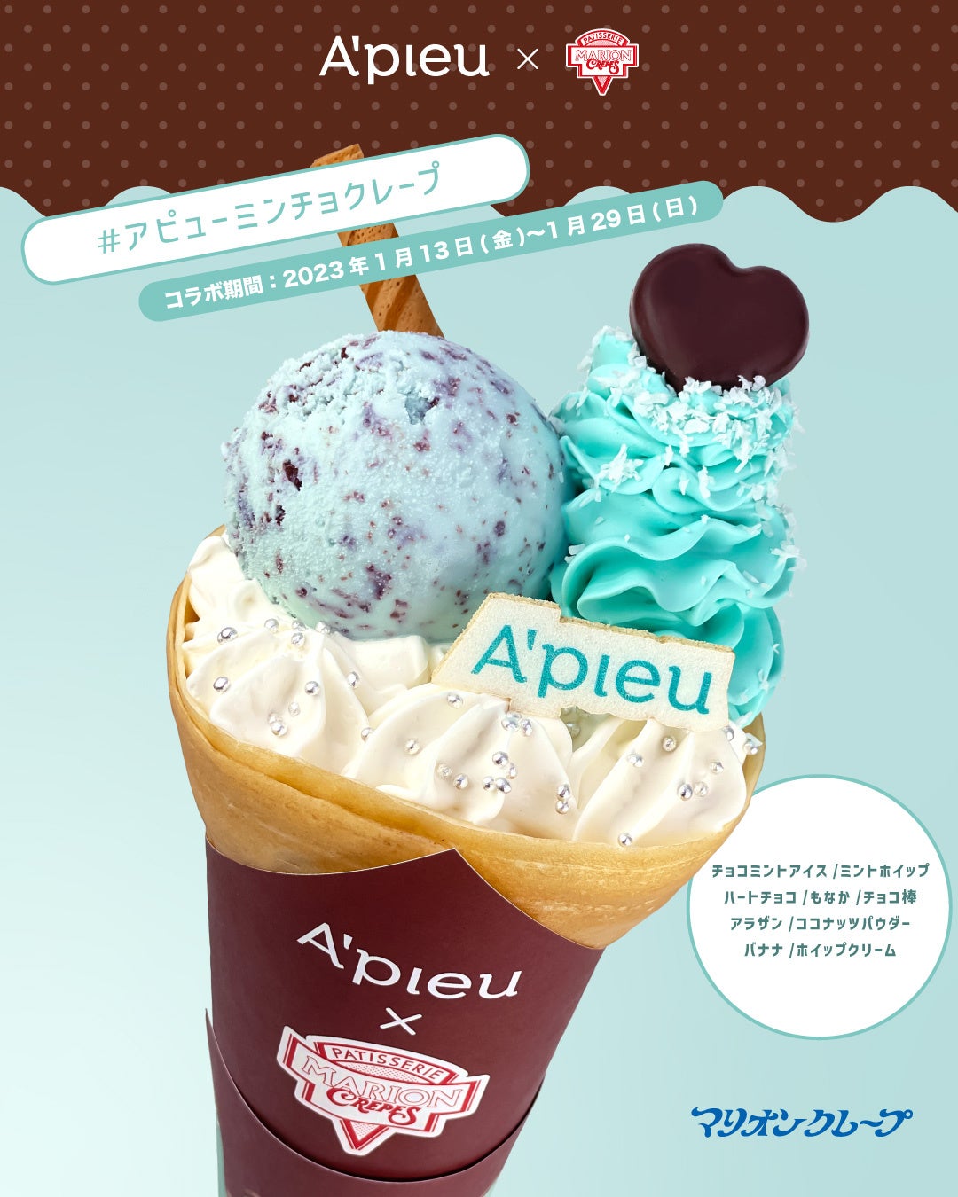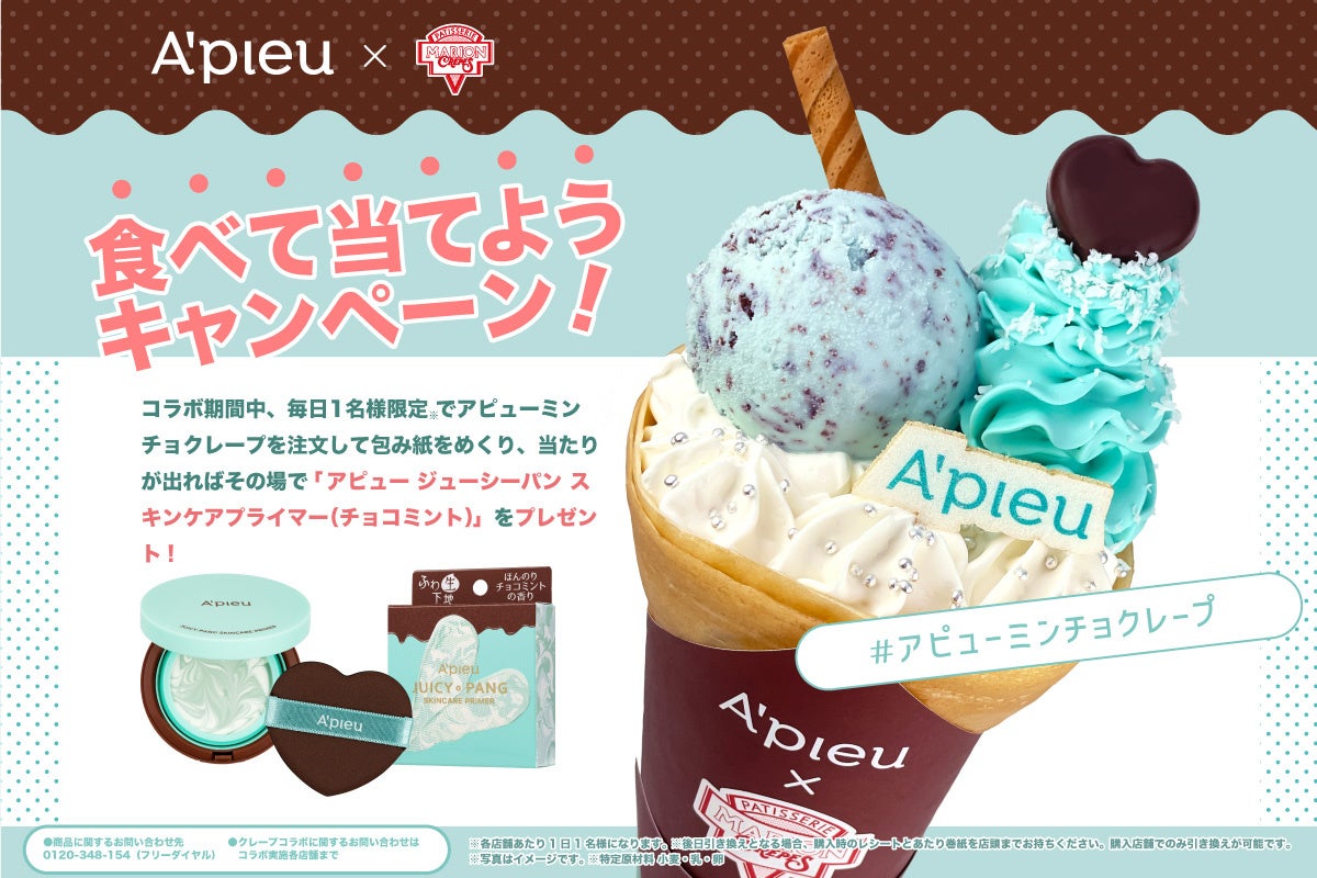 ふわ生バーム下地のアピュー ジューシーパン スキンケアプライマー「限定チョコミント」の発売に合わせ、マリオンクレープ首都圏5店舗にて、2023年1月13日~1月29日までの期間限定で、製品の「ミント × ホワイトカラー + チョコレートフレーバー」をイメージした「アピューミンチョクレープ」を発売いたします。その場で製品が当たる「食べて当てようキャンペーン」も同時開催!