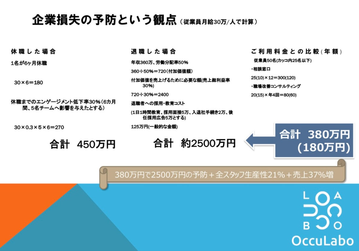 また、作業療法士との面談相談を繰り返しながら会社での自分の在り方、会社と自分の人生のパーパス(目標)のバランスをとり一致がすることが難しいなど次のステップに移る方が望ましい場合、社員の転職などの相談にのることも可能です。このことで多くの企業で問題となっている「サプライズ退職」を予防し「キャリアステップ卒業」とすることができます。更に、退職後、転職後も「オキュラボエスコート」を利用することで作業療法士が「人生のメンター」として伴走し続けます。