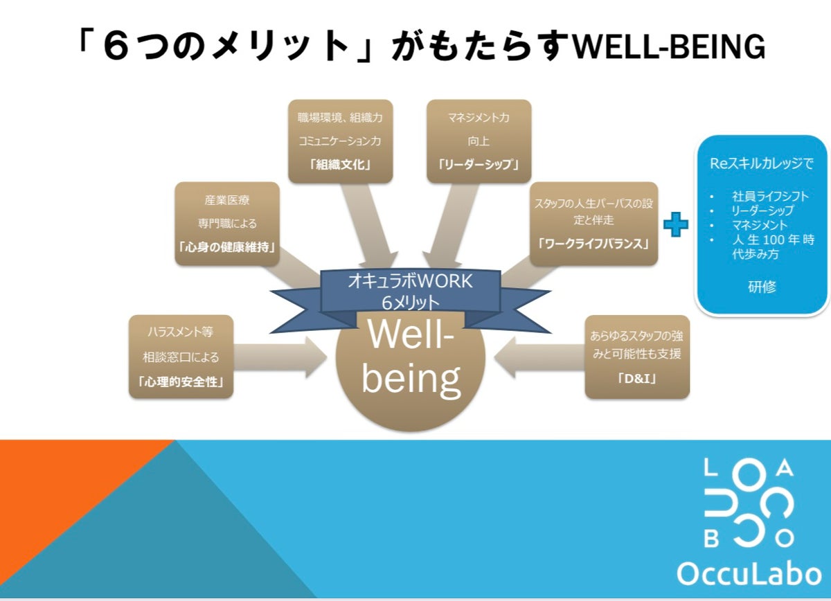 作業療法士は「人」「仕事/行為」「環境/組織」を同時に診ることができる他の専門職にはない視点を持っています。この視点を職場に活かすことで、それぞれがどの様な人生のターニングポイントにおいても、様々な障がいや困難を抱えても、どの年代でも、どのような国籍をもっていても、それぞれの個性、長所から、その時活かせる役割を獲得・再獲得し本来の意味の多様性な職場の風土づくりを行います。作業療法により、有能感、肯定感をもつと心理的安全性は確保され主体的でウェルビーイングに働くことに貢献できると考えます。