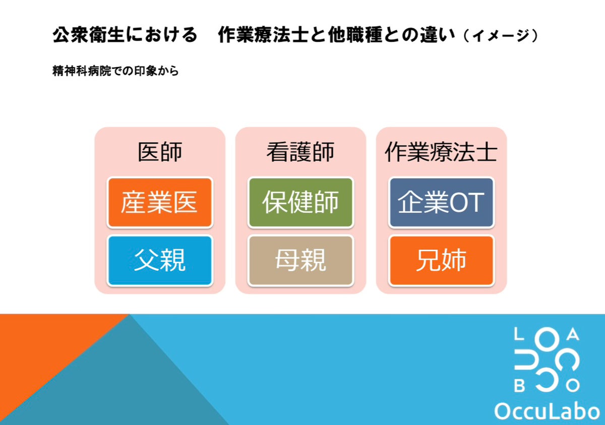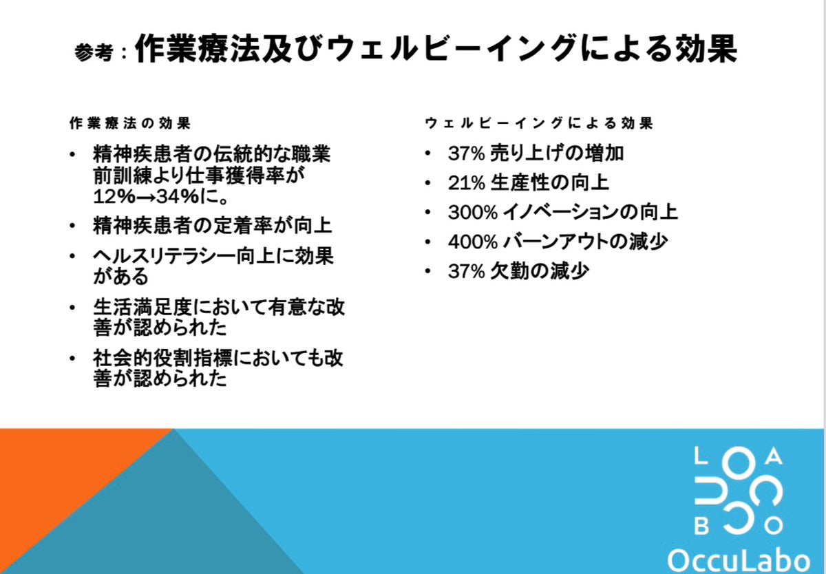 この考えを大学の作業療法教育課程で学んだ際に、自分自身がヤングケアラーとして送ってきた人生観が変化しました。そして精神科病院で勤務している際、多くの働く方々の悩みを伺い通院や入院に至る前に元気に働き続けること、その意欲・意志を持ち続けることの大切さとその支援の重要性を感じ「株式会社オキュラボ」設立に至りました。
