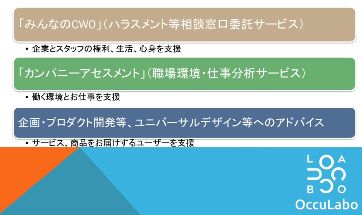 主に「契約企業スタッフ様の相談窓口サービス」、「職場環境等アセスメント」、「企画開発アドバイス」があります。