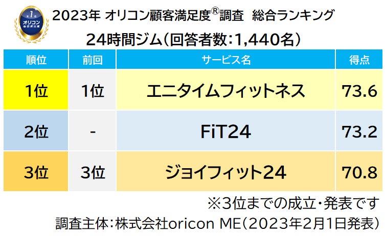 2019年の調査開始以来、3年ぶり3度目(2019、2020、2023年)の発表となる『24時間ジム』ランキングでは、【エニタイムフィットネス(株式会社Fast Fitness Japan 本社:東京都新宿区)】が、3度目の総合1位を獲得しました。