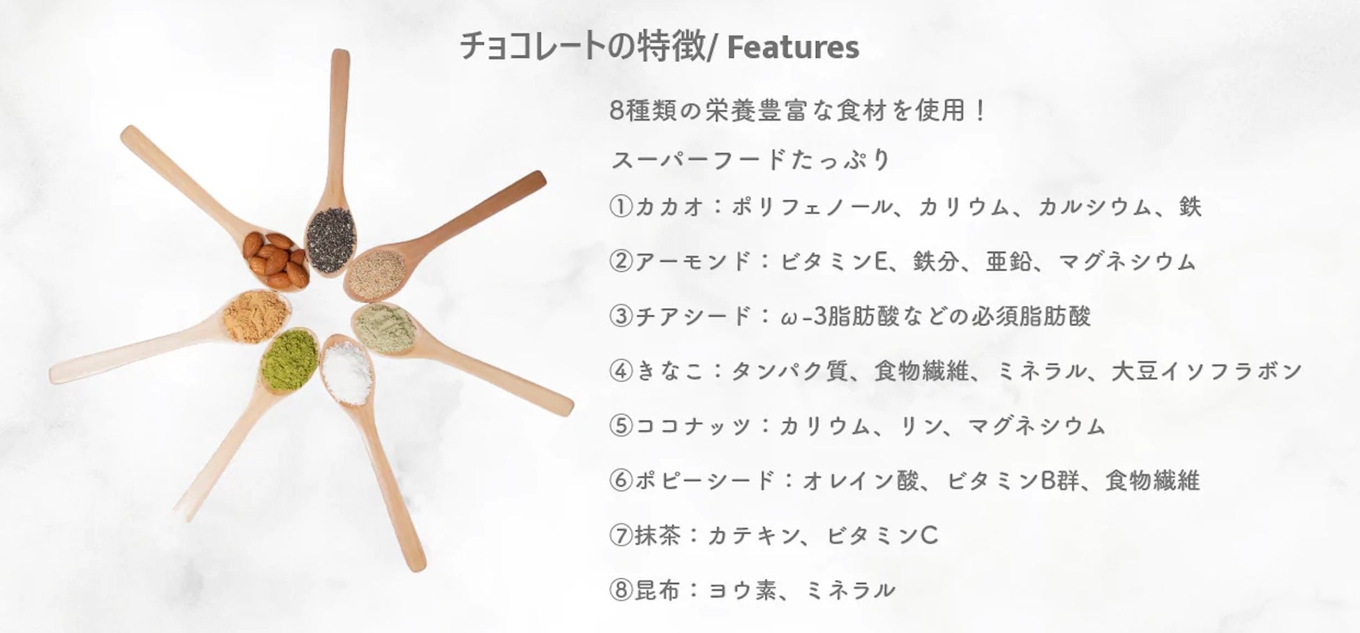 チョコレートの原料のカカオ豆に加え、アーモンド、きなこ、チアシード、ココナツ、ケシの実、抹茶、昆布などの栄養たっぷりの食材をふんだんに使用し、栄養価を最大まで高めた完全食チョコレート。