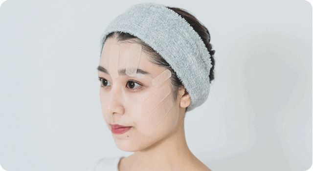 フェイシャルテーピングは当社が開発した顔トレ用テープを使用して顔の皮膚と表情筋を多方向に引っ張り、筋力・柔軟性を高め、さらに睡眠中に顔の形状を固定してクセづける”新時代のセルフ美容”です。
