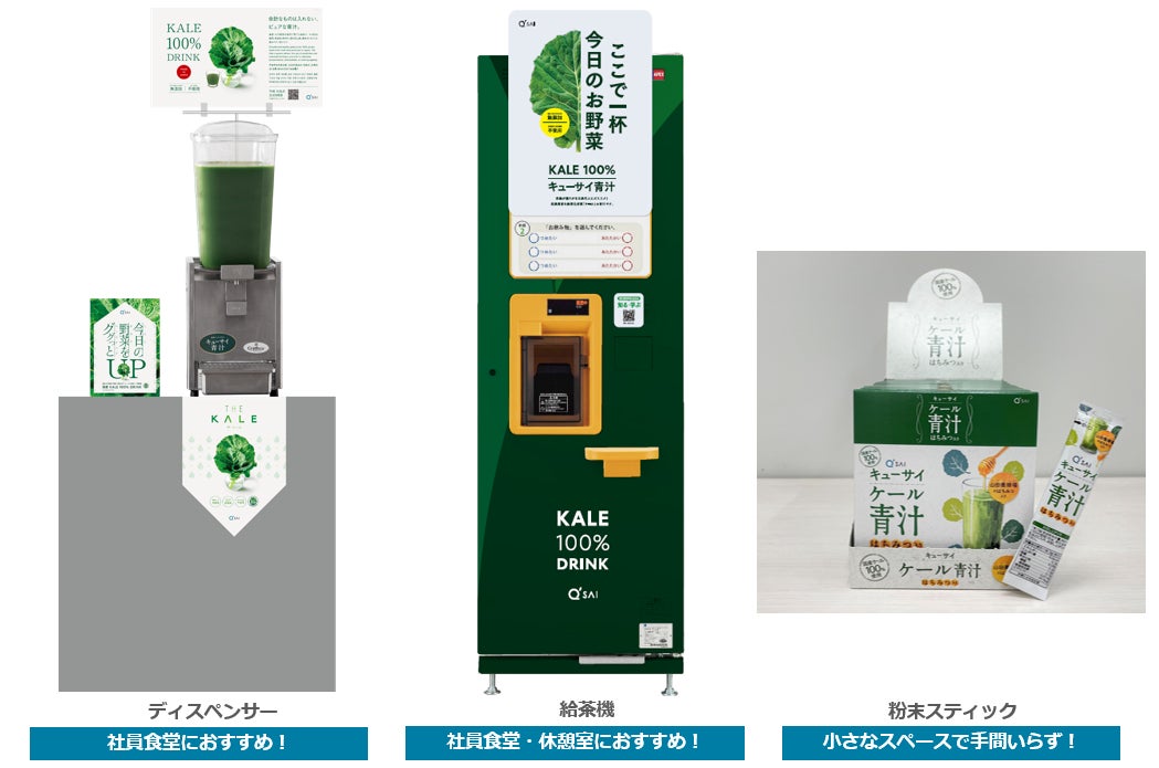 キューサイでは、自社の社員だけではなく、多くの企業さまの“健康経営”に貢献するため、企業さまの社員食堂や休憩室などへのケール青汁導入も行っています。ご提供方法は複数ご用意しており、設置場所や社員さまの人数などご希望をヒアリングし、企業さまに合わせて最適な方法をご提案しております。現在導入していただいている企業さまは、サービスを開始した2019年から471%増※となり、アフターコロナの今、社員の健康維持向上、健康経営のさらなる推進にお役立ていただいています。