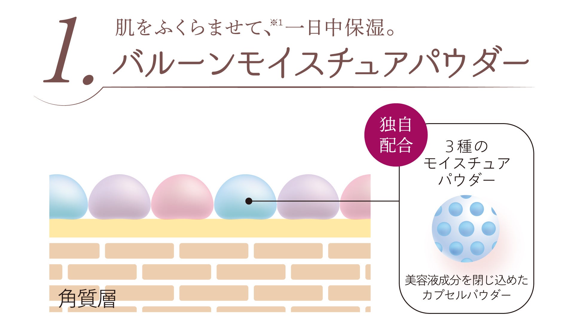 持続型美容液成分を内包した3種類の超微粒子パウダーを配合。肌に触れた瞬間、美容液成分が浸透※2し、一日中うるおいのある肌へ。