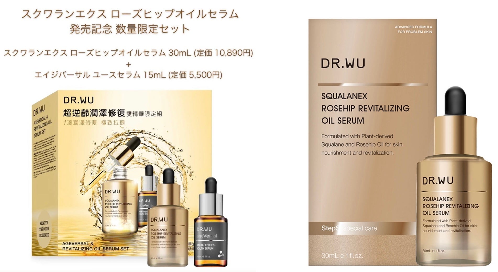 株式会社Earth Ship(読み:アースシップ、本社:茨城県常総市、代表取締役社長:谷 俊介 )は「DR.WU(ドクターウー)」より、オイルセラムシリーズとして新しく「SQUALANEX シリーズ」を展開いたしました。新シリーズの発売を記念して、新商品の「スクワランエクス ローズヒップオイルセラム」はエイジバーサルシリーズの最新美容液「エイジバーサル ユース セラム 15mL」を特典にしたスペシャルセットを数量限定で販売します。また、アットコスメ海外版にて5年連続でベストコスメ受賞中の「エイジバーサル リペア オイルセラム」は、名称を「スクワランエクス リペア オイルセラム」に変更し、パッケージをリニューアルいたしました。