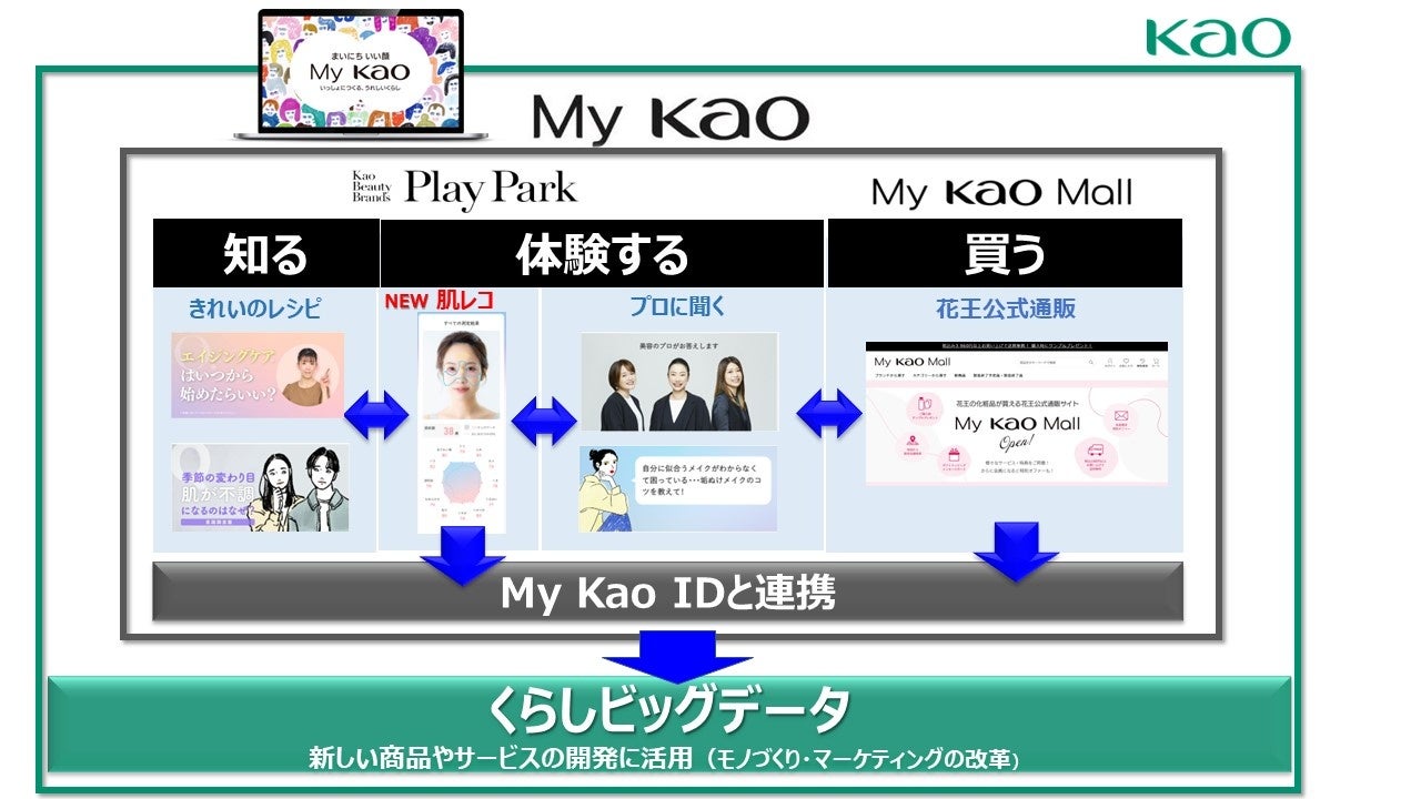「My Kao」は、2022年12月15日にオープンした「知る」「体験する」「買う」「創る」の4つの機能からなる双方向のデジタルプラットフォームです。「My Kao ID」というOne-IDでお客さまとつながり、お客さまを深く理解することで、さまざまなUX(顧客体験)を提供していくことをめざして運用しています。