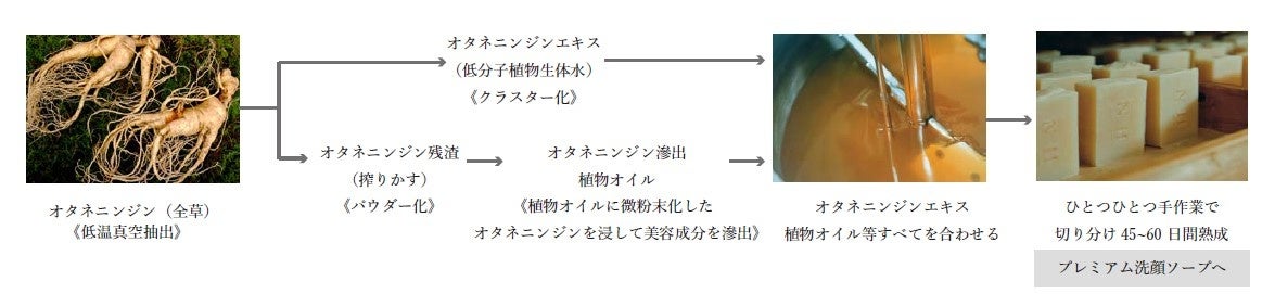3年間かけて大切に育てたオタネニンジンの全草を、有用成分を壊さない低温真空抽出法でエキス化します。エキスを絞った後の残渣は低温乾燥させパウダー状にし、オーガニックシアバター、コメヌカ、ココナッツオイルなどの一番搾りの植物オイルにつけこみ、1週間滲出することで美容成分をあますことなく抽出。水は1 滴も使わず、仕込み水にすらオタネニンジンの生体水を使用し、原料を合わせた後は、職人が低温でじっくり釜焚きするコールドプロセス製法で45~60 日間かけて熟成させます。こうして時間と手間をかけて作られたプレミアム洗顔ソープは、植物のちからをあますことなく肌に届け、健やかな状態へと導いてくれます。