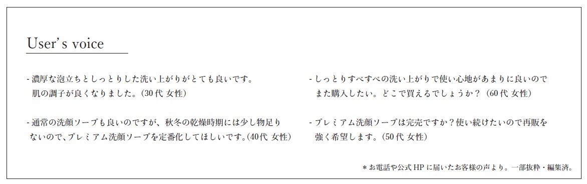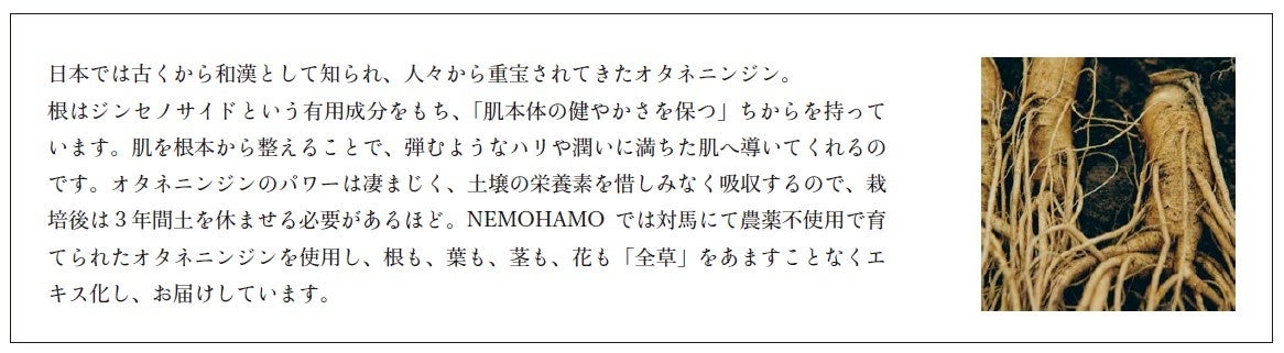 NEMOHAMO を象徴する植物であり、保湿、エイジングケア*1 効果の高さでしっとりなめらかな肌へと導くオタネニンジンを、水を一滴も使わずにまるごと配合したプレミアム洗顔ソープ。2019 年、2022 年と限定販売を行う度に、今までにない*2 贅沢な使用感が高い支持を受け、再販を希望する声が多く寄せられました。乾燥やエイジングの悩みを持つNEMOHAMO ユーザーの声にお応えし、こだわりの製法はそのままに、より環境に配慮したパッケージと手に取りやすい価格の定番製品として、長くご愛用いただくためのラインナップに加わります。