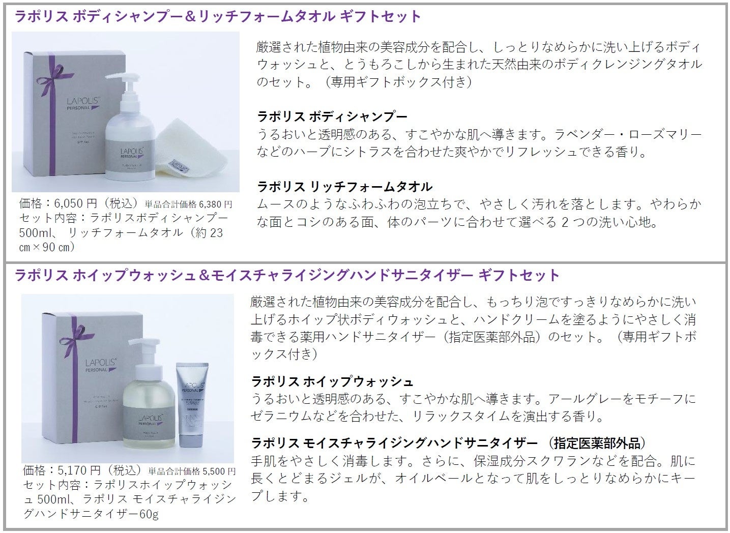 株式会社プロティア・ジャパン(本社:東京都港区、代表取締役社長:マーク C. ミンター)は、パーソナルケアブランド「LAPOLIS(ラポリス)」から2種類のギフトセット「ラポリス ボディシャンプー&リッチフォームタオル ギフトセット」と、「ラポリス ホイップウォッシュ&モイスチャライジングハンドサニタイザー ギフトセット」を2023年5月15日(月)より公式オンラインストアLive Active STORE(リブアクティブストア)や全国の取扱い店舗等にて発売いたします。
