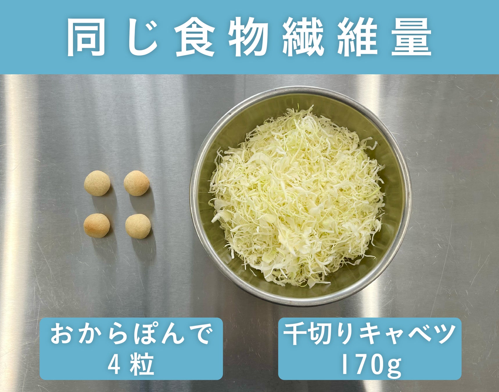 皆さんご存じの通り、おからには沢山の食物繊維が含まれています。おからぽんでに含まれる食物繊維は1食3.2gで、キャベツ170g分に相当します。