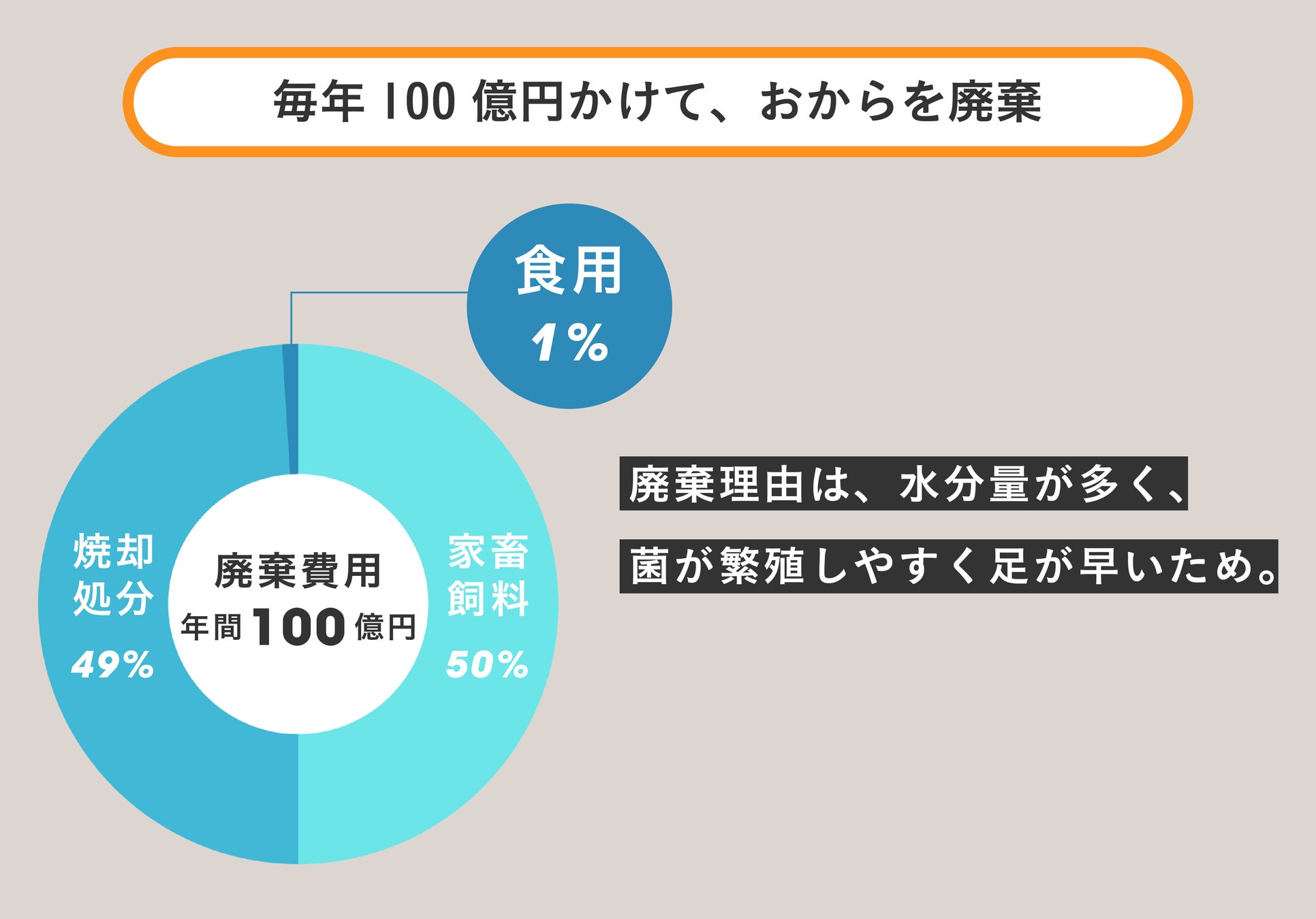 大豆消費大国である日本は年間200万トンのお豆腐が製造されています。その過程で『約70万トン』のおからが発生しますが、その多くが家畜飼料に使用されたり、焼却処分されてしまったり、食用利用されているのはなんとたった”1%”です。