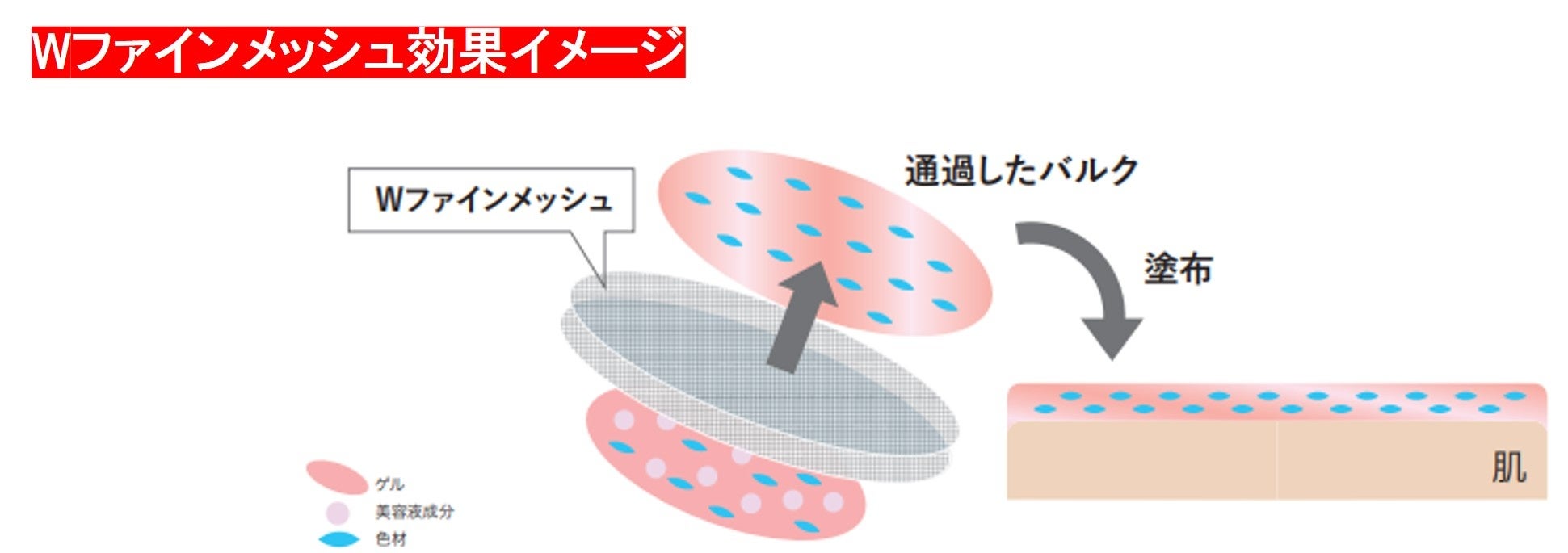 美容液成分を抱えた構造のゲルが2層のファインメッシュを通過する際に、みずみずしい感触に変化、クセになる使い心地を叶えます。