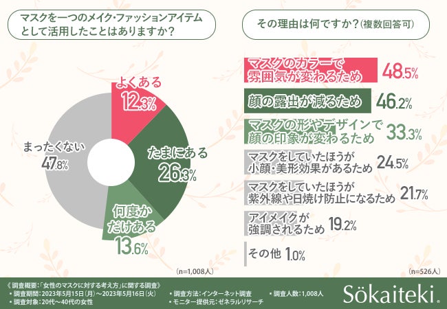 そこで、「マスクを一つのメイク・ファッションアイテムとして活用したことはありますか?」と質問したところ、『よくある(12.3%)』『たまにある(26.3%)』『何度かだけある(13.6%)』『まったくない(47.8%)』という回答結果になりました。