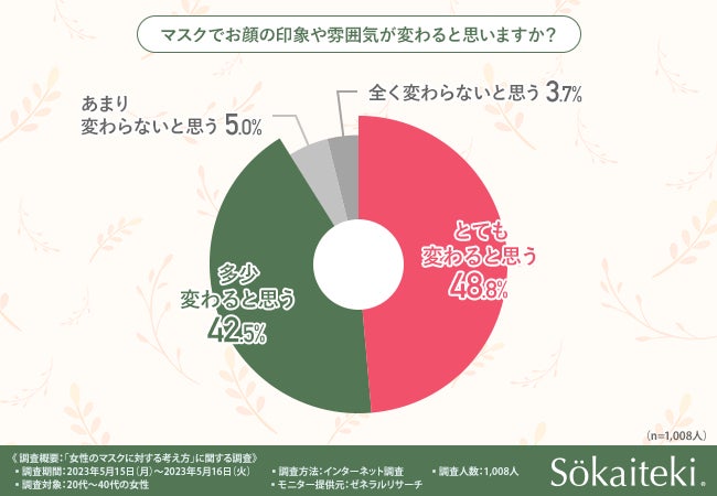 「マスクでお顔の印象や雰囲気が変わると思いますか?」と質問したところ、『とても変わると思う(48.8%)』『多少変わると思う(42.5%)』『あまり変わらないと思う(5.0%)』『全く変わらないと思う(3.7%)』という回答結果になりました。