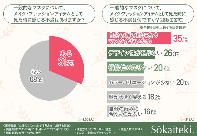 「一般的なマスクについて、メイク・ファッションアイテムとして見た時に感じる不満はありますか?」と質問したところ、3割以上の方が『ある(31.7%)』と回答しました。