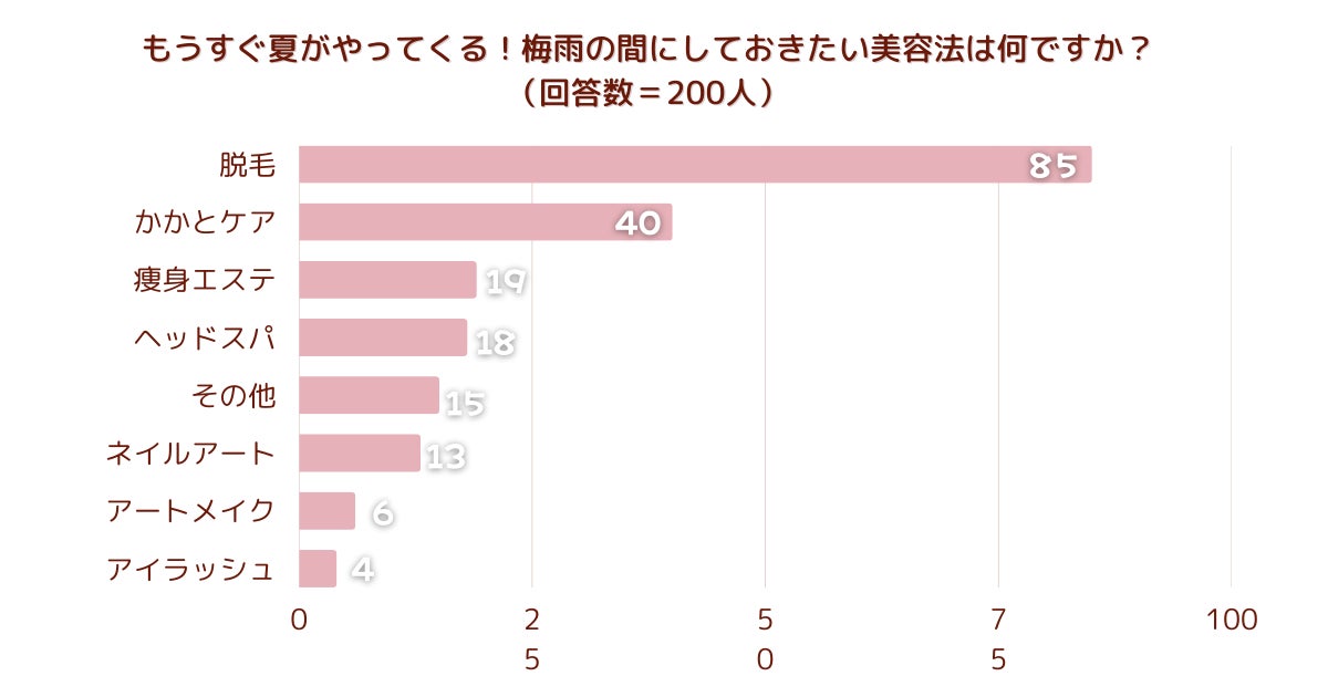 「もうすぐ夏がやってくる!梅雨の間にしておきたい美容法は何ですか?」とアンケート調査した結果、1位は『脱毛』でした。