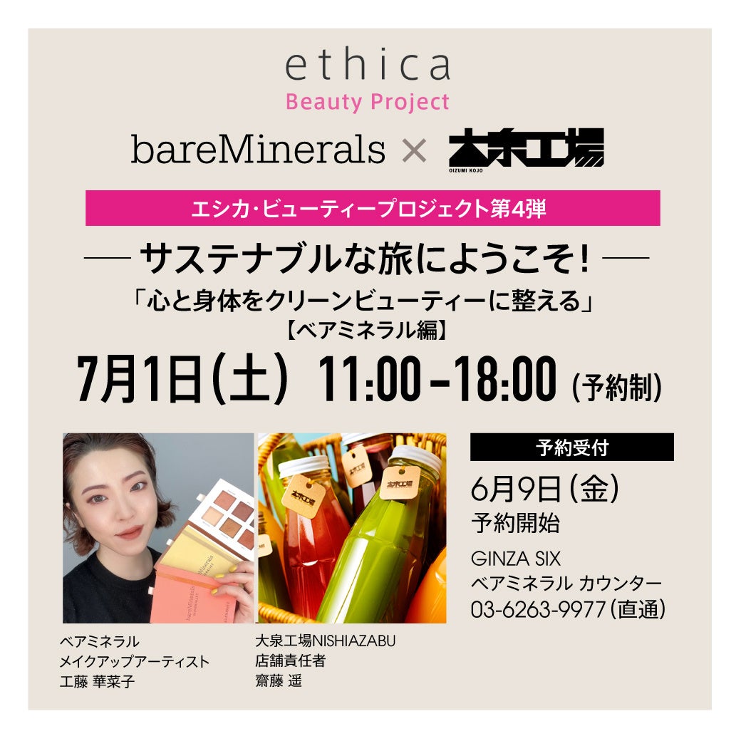クリーンビューティーのリーディングブランド「ベアミネラル」を輸入販売するオルヴェオン グローバル ジャパン株式会社(本社:東京都中央区、代表:菅野 沙織)は、webマガジン「ethica(以下、エシカ)」を運営する株式会社トランスメディア(本社:東京都港区 代表取締役:大谷賢太郎)と、株式会社大泉工場(本社:埼玉県川口市、代表取締役:大泉寛太郎)とコラボレーション。