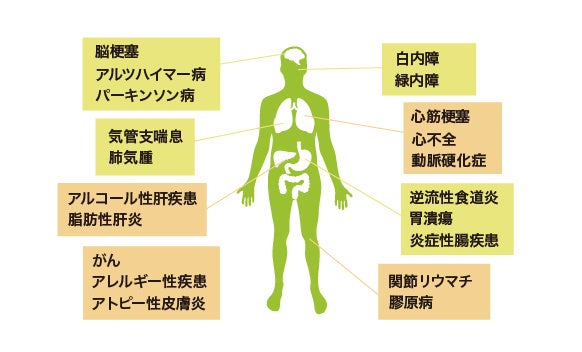 「酸化ストレス」があらゆる疾患に関連することが、ようやく最近になって知られるようになってきました。主原因とされる活性酸素種 (ROS)は日々の呼吸の副産物として産生されるほか、紫外線や放射線、細菌やウイルス、大気汚染などの外的因子や、喫煙や大量のアルコール、そして偏食による生活習慣、病気やストレスによっても毎日産生されます。一方、体内には元々ROSを消去する働き(抗酸化力)が備わっており、これにより身体はROSによる障害を抑えることができるのです。しかし、年齢と共にその働きが衰えROSが抑えきれなくなると、細胞の障害や炎症などが起こり、実に150種類もの病気に繋がると言われています。この不均衡が酸化ストレスです。