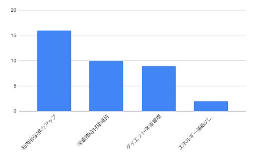 調査結果からは、筋肉増強や筋力アップが最も一般的な目的となっています。また、栄養補給や健康維持、ダイエットなどの目的も一定の人々にとって重要です。