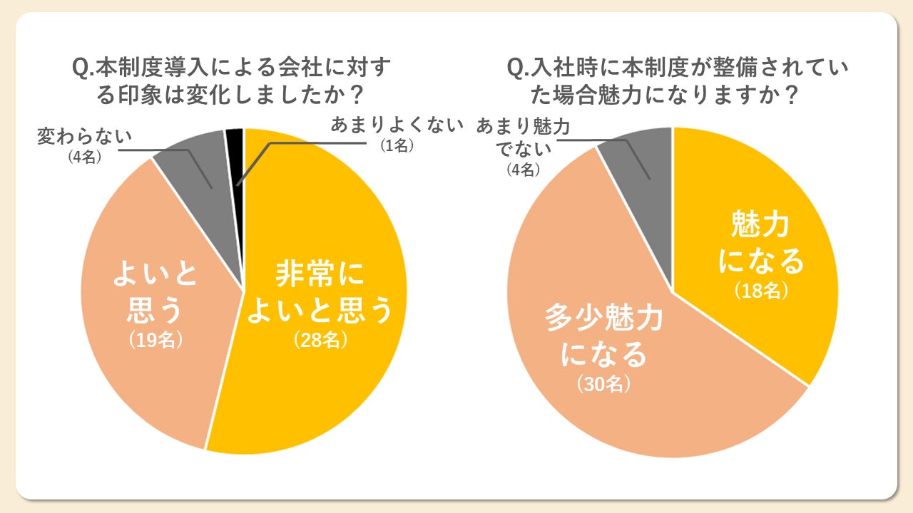最後に入社時に本制度が整備されている場合、魅力になるか?という質問に対しては「魅力になる(18名)」「多少魅力になる(30名)」が約9割の回答があり、高評価を得ました。今後は本制度導入にあたって、働きやすさに繋がっているかなど調査してまいります。