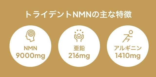 トライデントNMNは、ギリシャ神話に登場する海の神であるポセイドンが持つ、三叉(さんさ)の槍、いわゆる「トライデント」をモチーフに、NMNとアルギニン、亜鉛が三位一体となって3つの成分が効果的に身体に作用することを目的に開発されました。