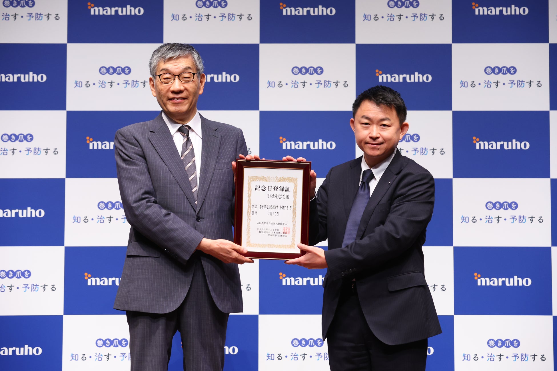 その後、発表会当日である7月10日を【巻き爪を知る!治す!予防する!日】の記念日に認定したことを受けて、登録証の授与式を実施。一般社団法人 日本記念日協会・代表理事・加瀬清志さんに登壇いただきました。