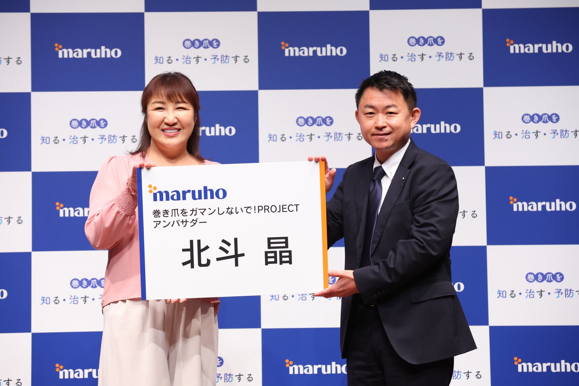 記念日登録証授与式の後は、「巻き爪をガマンしないで!PROJECT」のアンバサダーに就任された北斗晶さんが登壇。北斗さん自身も過去に巻き爪に悩まされていた経験があったそうで、巻き爪の痛みや不安な気持ちは痛いほどわかるとコメント。「巻き爪の最初は違和感…ちょっと痛いな、という感じだったんです。病院に行くほどなのかな、と思ったり、何科に行けばいいのかな?と思ってなかなか受診にいたらなかったりもしたので、皆さんも気がついたら放置せずに治療をすることが大事かと思います」とアンバサダーとして受診の大切さを教えてくれました。アンバサダー就任式では医療機器事業部営業統括グループマネージャー・大石学より就任名刺を贈呈。アンバサダーとして巻き爪で困っている、悩んでいる人たちに治療の大切さを伝えていきたいと、意気込みを語りました。