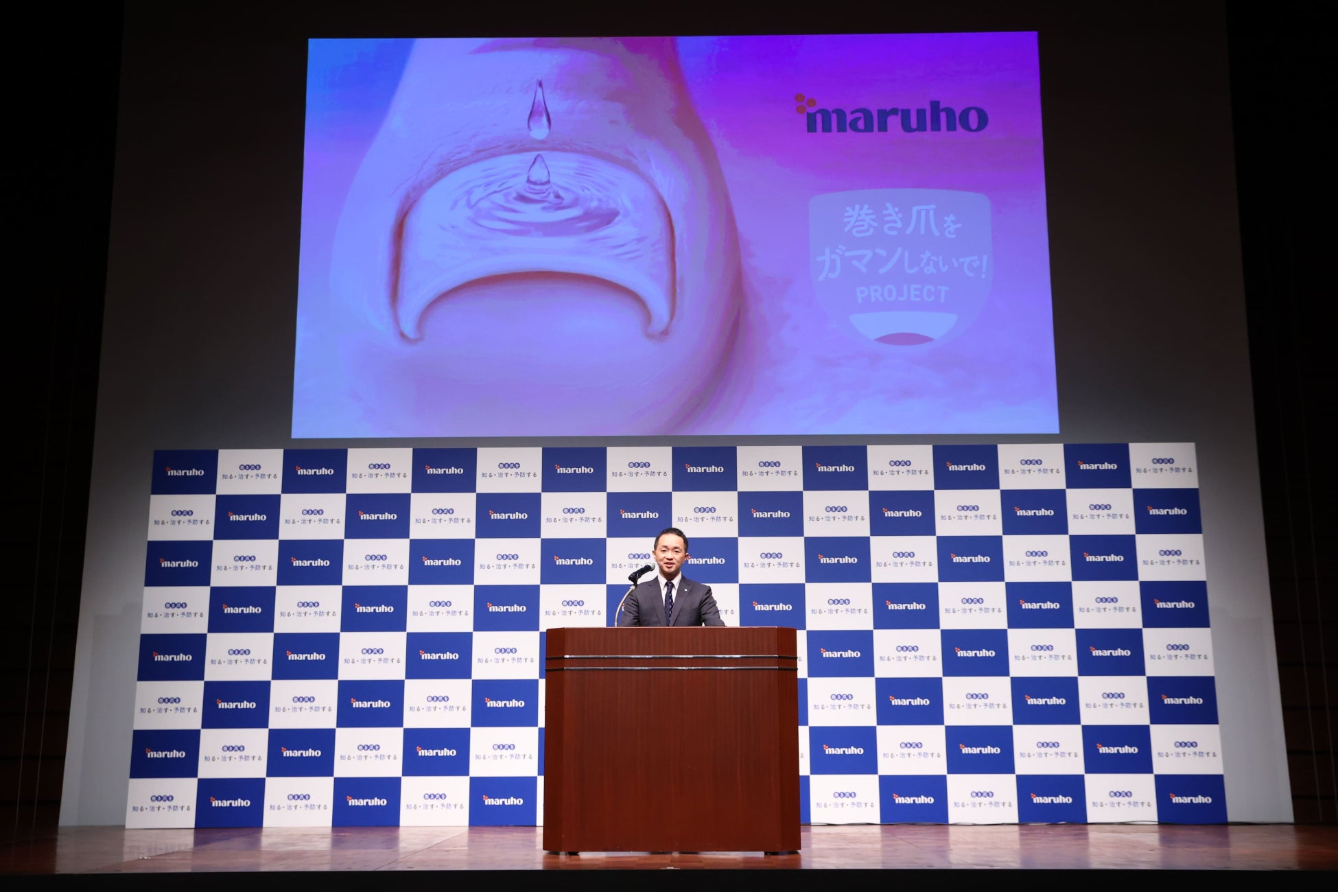 当日はマルホ株式会社 医療機器事業部営業統括グループ井村隆行が登壇し、巻き爪をガマンしないで!PROJECTに関する概要と巻き爪矯正の治療期間を短縮する新たな治療方法についての概要説明を行いました。このプロジェクトの意義として「医療機関の受診の推進、さらに矯正治療を行っていただきたい」と強い思いを語りました。さらに、巻き爪患者が増えるタイミングとして、「巻き爪」の検索数が7月が最も多くなることも紹介し、今回の記念日制定の由来についても触れました。
