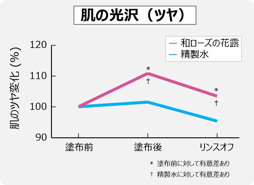 江戸の書物に記録されていた「花の露による光沢」をヒントに、『和ローズの花露』の肌ツヤ改善効果を評価しました。本原料を塗布した肌をグロッシーメーターで測定したところ、肌のツヤは約10%上昇し、その効果は水で洗い流した後も持続していました。これは原料塗布による表面光反射効果だけではなく、肌本来のツヤが改善されたものと考えられます。