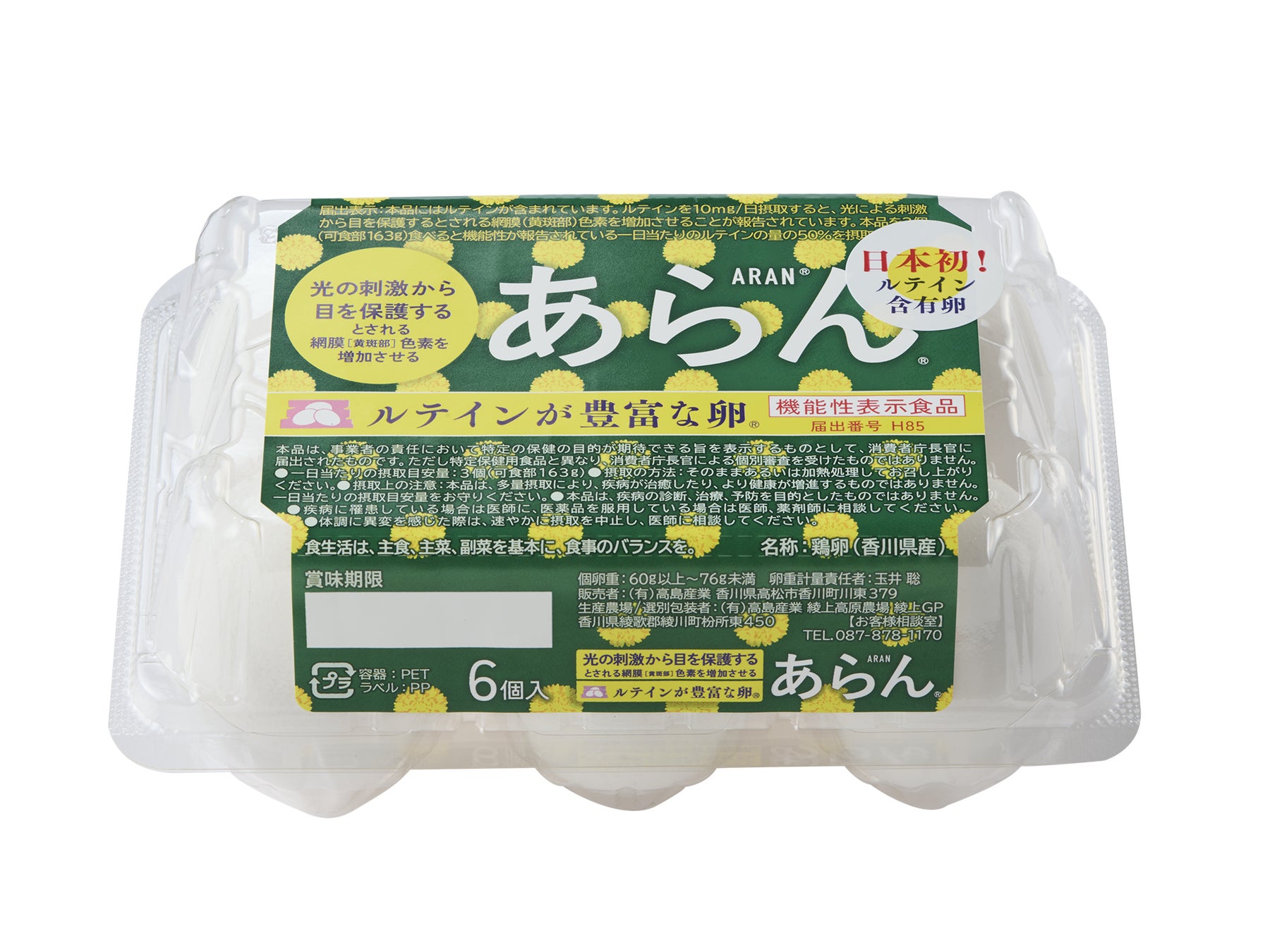 「あらん」は、日本初(2023年6月現在)のルテインを含む鶏卵の機能性表示食品です(届出番号H85)。ルテインは目を守る黄色の天然色素成分で抗酸化作用を持っています。人体では網膜(黄斑部)に存在し、光の刺激から目を保護する働きがあります。
