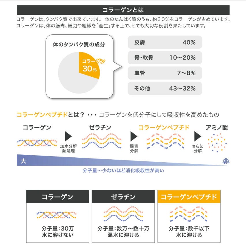 コラーゲンペプチドとは、簡単にいうと“コラーゲンを低分子にして、吸収性を高めたもの”です。今までコラーゲンは肌にいいとされてきましたが、実は、コラーゲンは経口摂取では実際には体に吸収されず、あまり効果がないとされていました。しかし、最近の研究から分子鎖を低分子にしてペプチド状にすることでさまざまな特性を示すことがわかってきております。