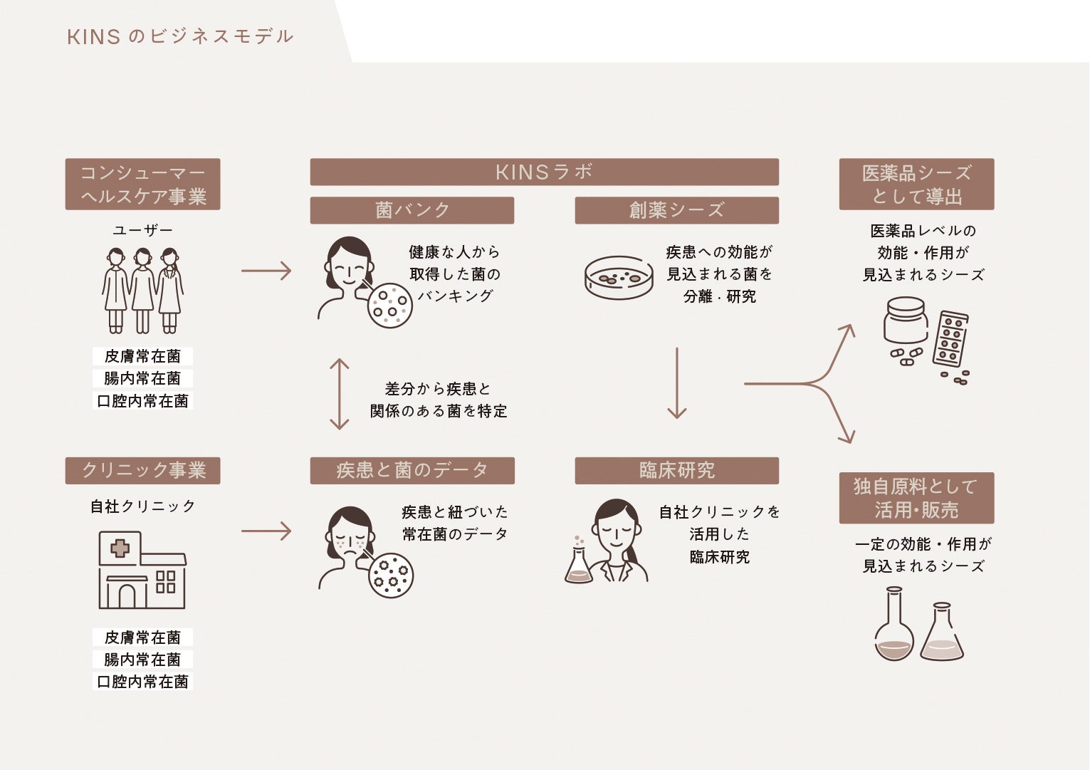 KINS は、美と健康を司る 1,000 兆個と言われる全身の菌(常在菌)をケアすることを提案し、研究、開発、販売までを一気通貫して行う、マイクロバイオームに特化したヘルスケア企業です。