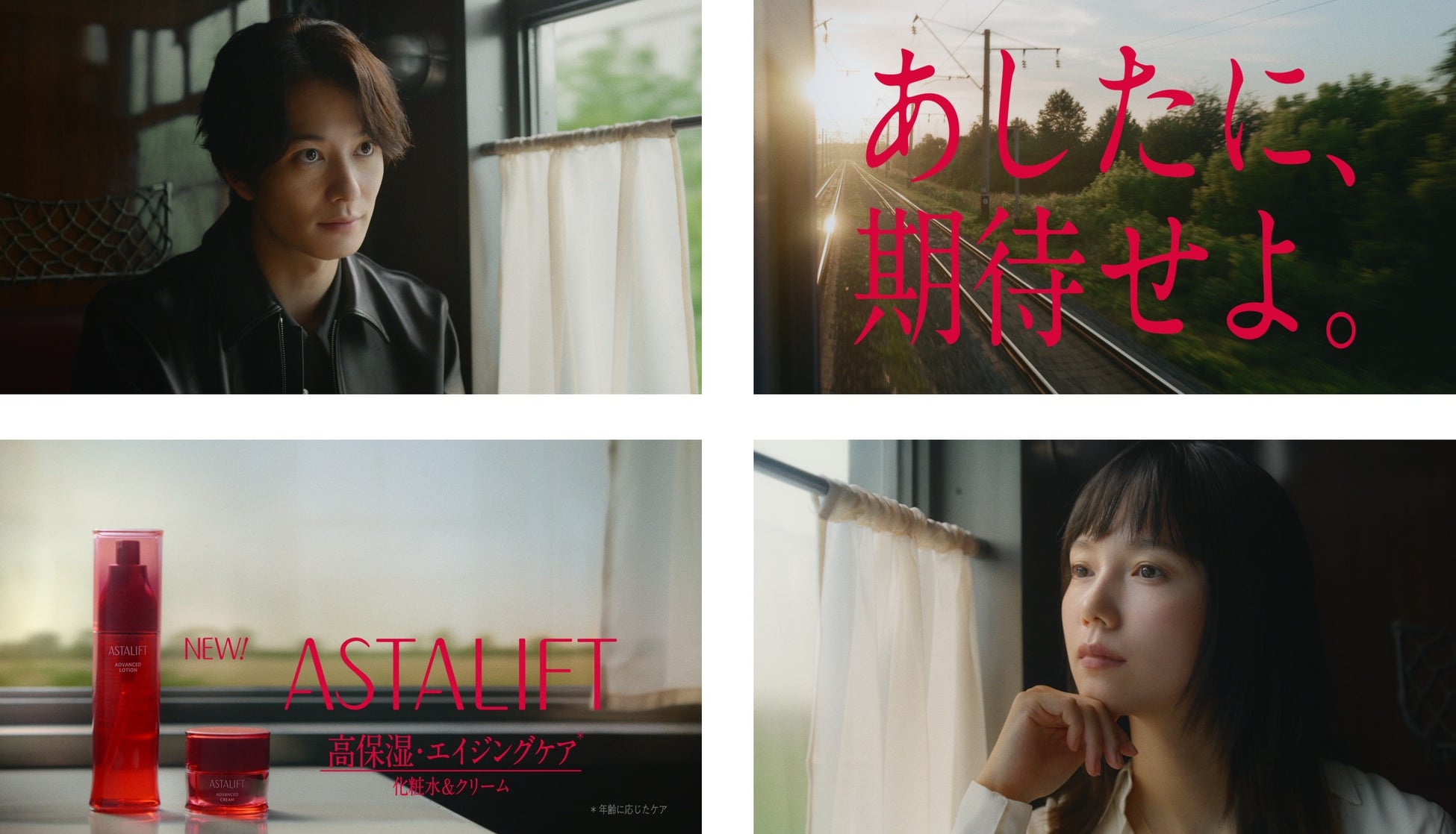 今回が初共演となる俳優の宮﨑あおいさんと岡田将生さんが出演。列車で偶然出会ったふたりの会話を通じて、「アスタリフト」のコア技術であるナノ分散技術と、年齢を重ねた肌全体にハリとうるおいを与える化粧水「アスタリフト アドバンスドローション」・クリーム「アスタリフト アドバンスドクリーム」(8月25日発売)の特長をお伝えします。