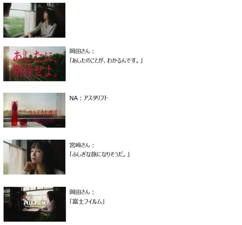 本TVCMには、俳優の宮﨑あおいさんと岡田将生さんが出演。宮﨑さん演じる“何かから逃れるように列車に乗り込む女性”と、岡田さん演じる“未来から来た男性”が偶然出会い、ふしぎな列車の旅が始まります。写真フィルムの開発で培ったナノ分散技術などを活用し“実感できる”スキンケアを目指す「アスタリフト」の魅力を、ふたりの会話と「あしたに、期待せよ。」というキャッチコピーでお伝えします。楽曲には、松田聖子さんの名曲「赤いスイートピー」を使用しています。