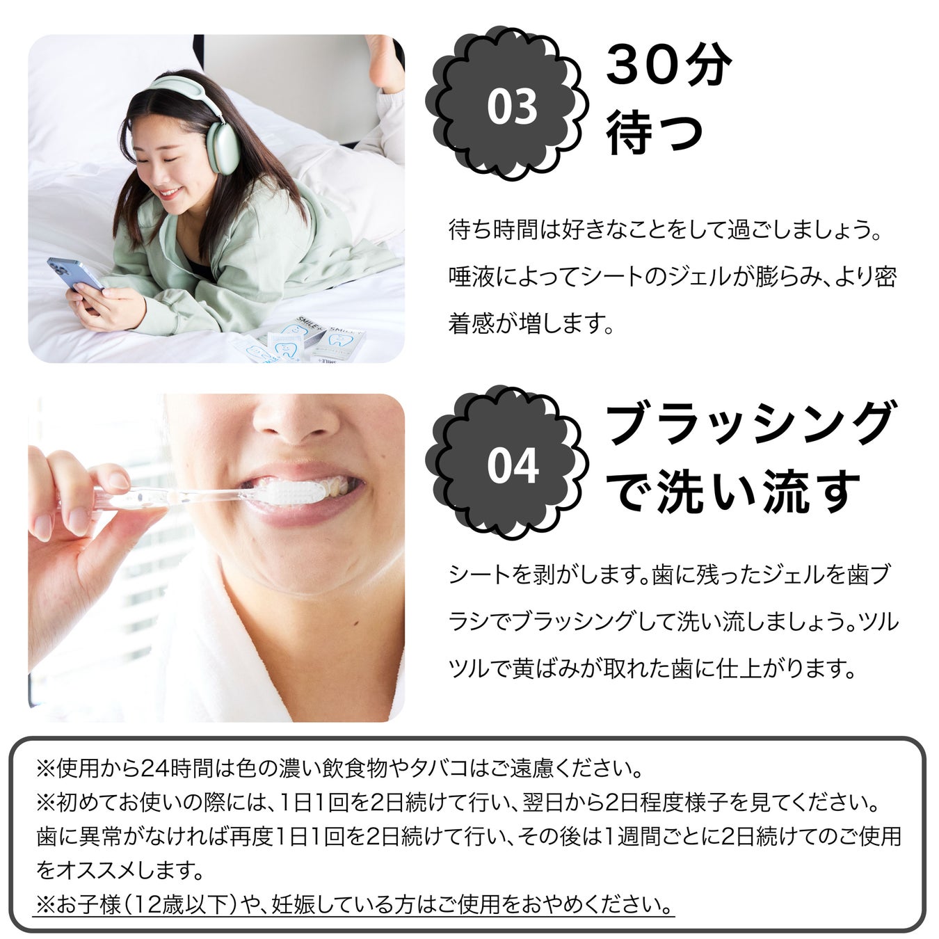 たった30分で完了。貼って剥がしてブラッシングするだけで、ホワイトニングができます。