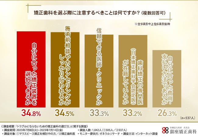 そこで、「矯正歯科を選ぶ際に注意するべきことは何ですか?(複数回答可)」と質問したところ、『自分に合った矯正装置を選択できるか(34.8%)』と回答した方が最も多く、次いで『施術前相談やカウンセリングがしっかり行われるか(34.5%)』『信頼できる医師・クリニックか(33.3%)』と続きました。
