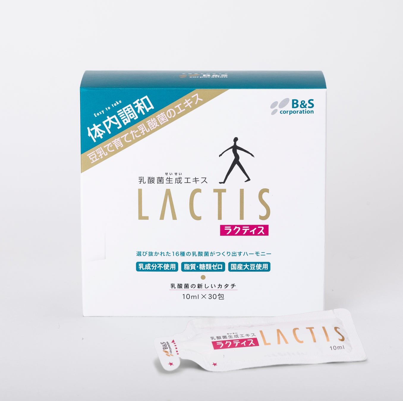 乳酸菌生成エキス「ラクティス」は、独自の16種類の乳酸菌で豆乳を発酵し、1年間熟成。有用成分のみを抽出したエキスです。生きた乳酸菌ではなく、乳酸菌が発酵中につくりだす成分と乳酸菌の菌体成分でできています。この2つの成分が「わたしの乳酸菌」にはたらきかけ、理想的な身体環境をつくるサポートをします。