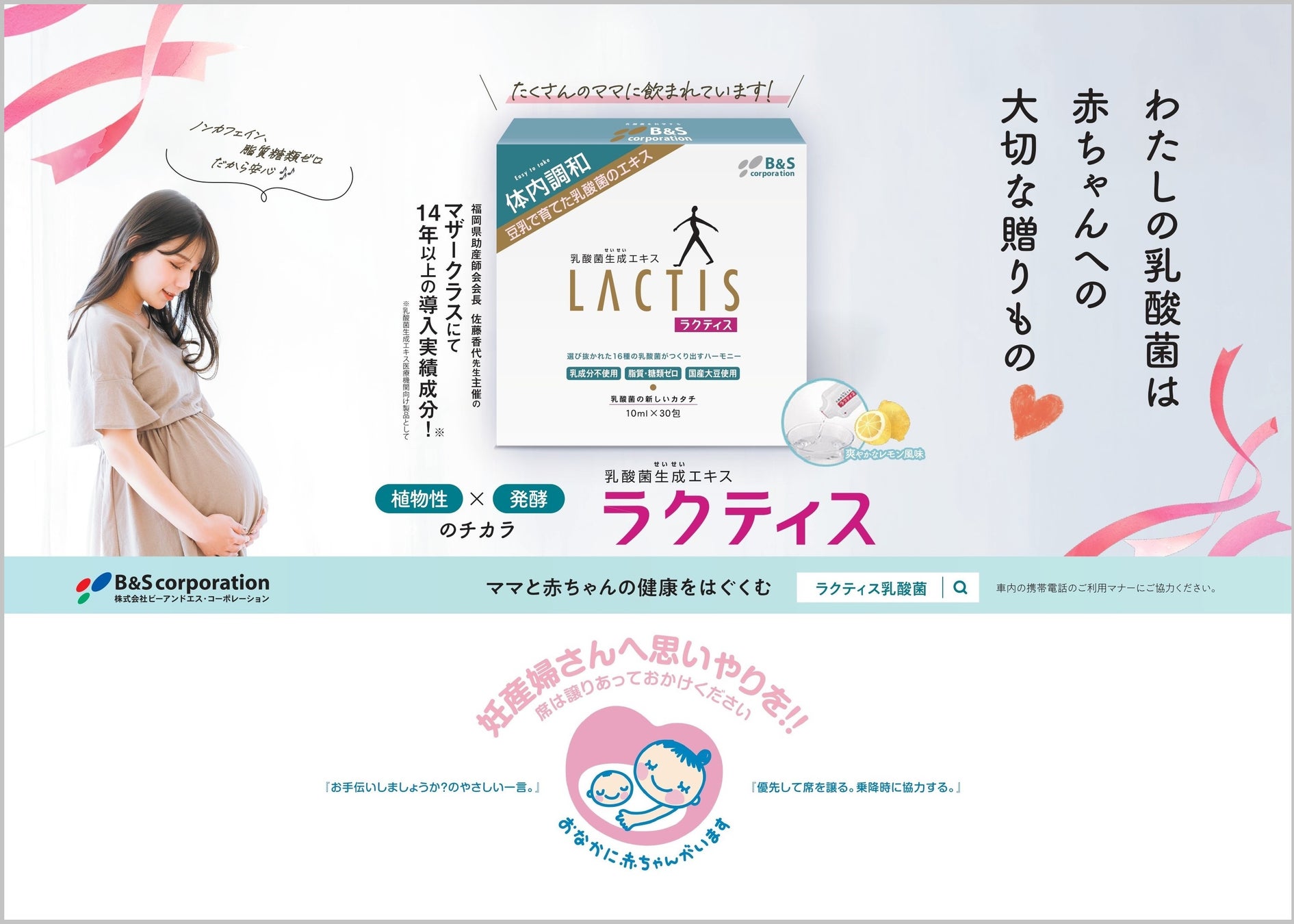 B&Sコーポレーションは「より多くの人が健体康心を実現することに貢献する」を企業理念に、100年以上にわたり乳酸菌研究を続けてまいりました。妊婦さんと赤ちゃんの健康に腸内環境が関係していることがわかってきている中、妊婦さんに腸内環境の大切さを広く知っていただきたいと思っております。今回、妊婦さんと赤ちゃんの健康にお役立ていただきたく、乳酸菌生成エキス「ラクティス」とマタニティマークとのタイアップ広告の掲出にいたりました。