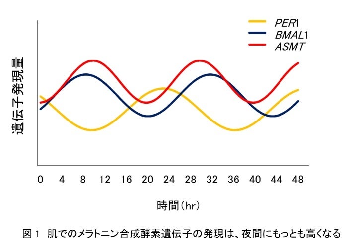 ASMT(肌でのメラトニン合成関連遺伝子)の遺伝子発現が、BMAL1(夜に発現が高まる遺伝子)と同様の変化をし、PER1(昼に発現が高まる遺伝子)とは逆の動きをしていることから、肌でのメラトニン合成は夜に高まることが示された。