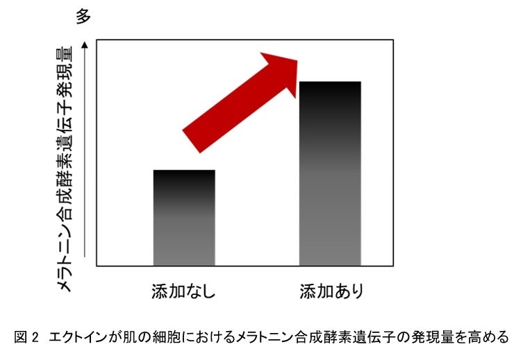 次に、肌におけるメラトニン合成酵素遺伝子の発現を高める成分を広く探索しました。その結果、エクトインに肌の細胞におけるメラトニン合成酵素遺伝子発現を高める効果があることを発見しました(図2)。夜間に合成が高まるメラトニンの合成が促進されることで、その抗酸化・抗炎症効果により肌がダメージ因子と戦う、肌の免疫機能の強化が期待できます。