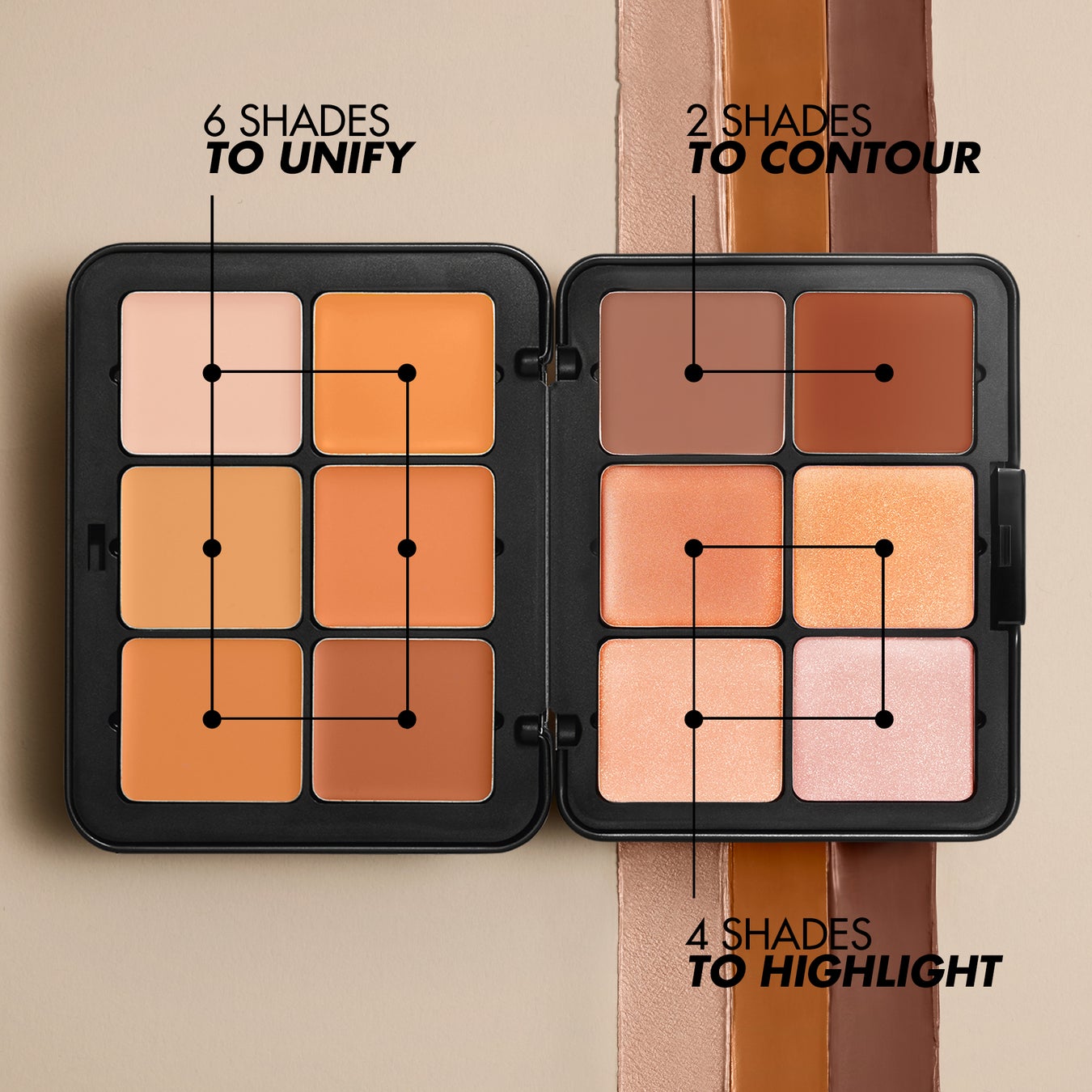 さまざまな肌トーンにマッチする12色のシェードは、ファンデーション6色とコントゥア2色、ハイライト4色といったプロのメイクアップアーティストこだわりセレクション。単色使いはもちろん、複数の色を混ぜてもOK。無限に広がる色の表現をお楽しみください。