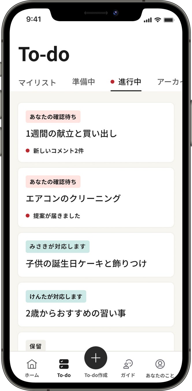 アプリを通じてくらしのTo-do(タスク)を依頼すると、Yohanaチーム(実在する人間)が、Yohanaメンバーの要望を細やかに伺いながら、解決に向けてサポートします。例えば、毎日の献立と買い物リストの作成、食材手配、子どもの習いごと探し、週末のお出かけから旅行の手配など、幅広いTo-doに対応し、解決に向けたリサーチ・提案、予約・手配までをワンストップ(*2)でサポートする点が特徴です。