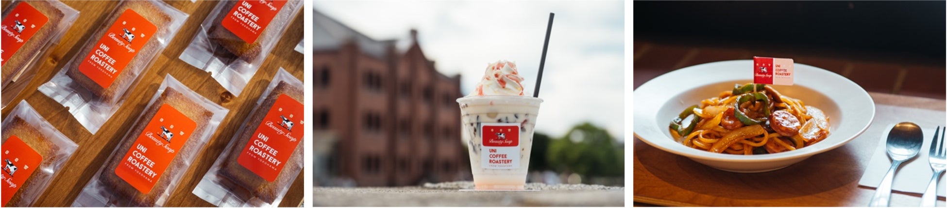 横浜発祥の人気カフェ「UNI COFFEE ROASTERY」にて赤箱コラボの限定メニューが登場します。赤箱のシンボルである牛柄をコーヒーゼリーで表現したコーヒーゼリーラテや、赤箱に使用されている高品質のミルクバターを使ったミルクフィナンシェを発売。ラテとフィナンシェは「UNI COFFEE ROASTERY」(11店舗・レストラン除く)にてお買い求めいただけます。また、横浜赤レンガ倉庫店限定でお召し上がりいただける、赤箱とコラボした「赤箱コラボ横濱ナポリタン」も登場。赤箱のパッケージデザインの旗がのっているほか、赤箱にも使用されている高品質のミルクバターによって味付けされており、コク深い味わいのナポリタンです。